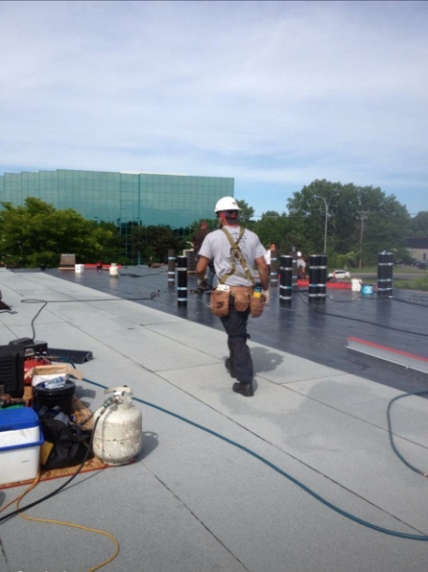 Réalisations résidentiels et commerciale Toiture en élastomère composée d’asphalte modifié de polymère. Couvreur posant une membrane élastomère. Toit élastomère en gris clair. Exemple d’installation d’une toiture élastomère commerciale. Exemple d’un joint de toiture en élastomère. Une toiture en membrane élastomère gris clair avec plusieurs puits de lumière intégrés. Un toit en membrane élastomère gris clair avec un conduit de cheminée. Plusieurs rouleaux de membrane élastomère noire déroulés sur un toit plat. Toit élastomère gris clair posé sur un toit et une corniche adjacente. Il convient de prêter attention à tous les éléments qui doivent être étanches. Une installation correcte est primordiale pour une installation réussie et une toiture qui durera des années. Deux couvreurs posent la membrane élastomère sur un toit. Remarquez le goudron foncé nécessaire à l’installation d’un toit plat. Les membranes pour toits plats n’existent pas seulement en noir ou en gris. Notez le harnais et les mesures de sécurité prises par votre couvreur typique L’image prototypique des rouleaux de membrane élastomère Soprema.